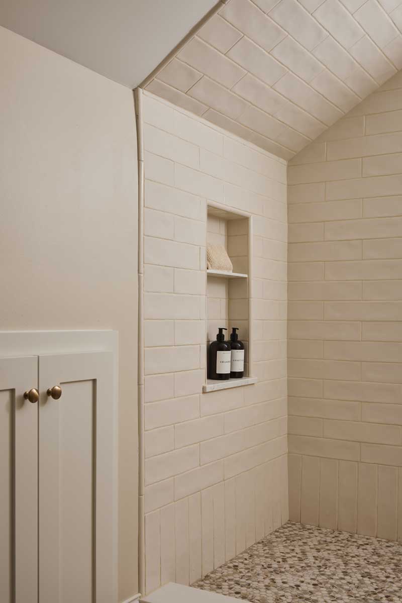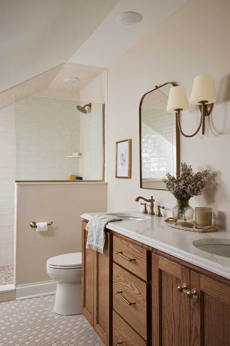 Upstairs, the layout was redesigned to maximize usable space. Relocating the bathroom allowed for a larger, more functional design that feels bright and cohesive with the rest of the home.